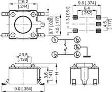 6 x 6mm surface mount switch, gull wing terminals, round stem, grounded
