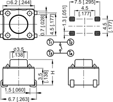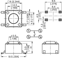 6 x 6mm surface mount switch, gull wing terminals, round stem, grounded