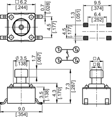 6 x 6mm surface mount switch, gull wing terminals, square stem