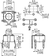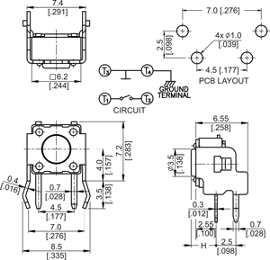 6 x 6mm through hole switch, right angle, w/ground terminal